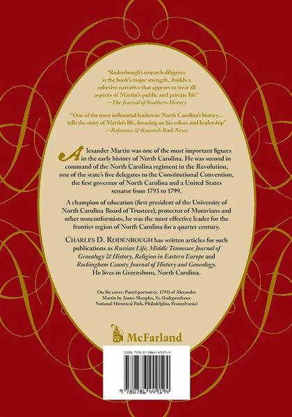Governor Alexander Martin of North Carolina was one of the most important figures in the colonial and early state history of North Carolina. A 1756 graduate of Princeton, he was the first president of the Board of Trustees of the University of North Carolina. He served longer as governor of the state than any other person until the election of Luther Hodges in the 20th century. He was conferred an honorary doctorate by Princeton and elected to membership in the American Philosophical Society while he was a U.S. senator. While in the Senate, he fought successfully to open the Senate to the public. He was one of five North Carolina delegates to the Constitutional Convention in Philadelphia. He was a friend and protector of the Moravians and other non-conformists. He was the most powerful and effective leader from the frontier region of North Carolina for a quarter of a century. The first chapters of this biography discuss Martin's parents and their high regard for education, his time at Princeton, and his arrival in North Carolina in 1760. The next chapters explore Martin's and Rev. David Caldwell's effort to prevent bloodshed during Governor Tryon's confrontation with the Regulators that led up to the Battle of Alamance, Martin's experiences in the war as second in command of the North Carolina Regiment, his election as senator from Guilford County to the General Assembly in 1777, and his much-celebrated election as governor in 1781. The final three chapters of the book include information about his years in the U.S. Senate, his retirement at his home ""Danbury"" in Rockingham, North Carolina, his relationship with his family and his very detailed last will and testament. His home, ""Danbury,"" later gave its name to Danbury, North Carolina, in Stokes County, which his nephews helped found about 1848, long after his death.