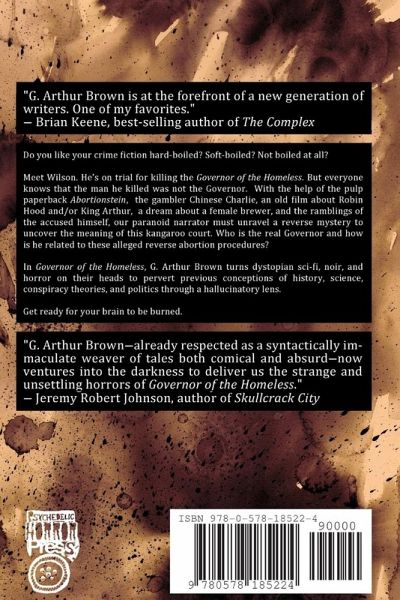 Do you like your crime fiction hard-boiled? Soft-boiled? Not boiled at all? Meet Wilson. He's on trial for killing the Governor of the Homeless. But everyone knows that the man he killed was not the Governor. With the help of the pulp paperback Abortionstein, the gambler Chinese Charlie, an old film about Robin Hood and/or King Arthur, a dream about a female brewer, and the ramblings of the accused himself, our paranoid narrator must unravel a reverse mystery to uncover the meaning of this kangaroo court. Who is the real Governor and how is he related to these alleged reverse abortion procedures? In Governor of the Homeless, G. Arthur Brown turns dystopian sci-fi, noir, and horror on their heads to pervert previous conceptions of history, science, conspiracy theories, and politics through a hallucinatory lens. Get ready for your brain to be burned.