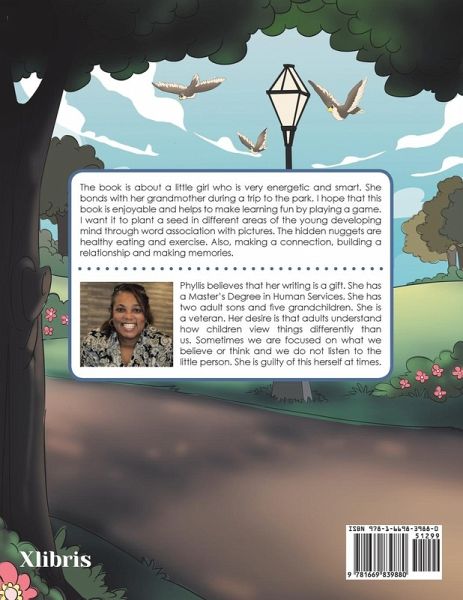 The book is about a little girl who is very energetic and smart. She bonds with her grandmother during a trip to the park. I hope that this book is enjoyable and helps to make learning fun by playing a game. I want it to plant a seed in different areas of the young developing mind through word association with pictures. The hidden nuggets are healthy eating and exercise. Also, making a connection, building a relationship and making memories.