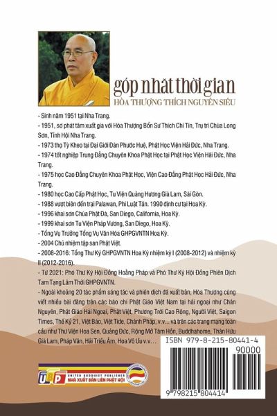 Nhi¿u bài vi¿t ¿¿¿c thu nh¿t l¿i ¿¿ góp thành t¿p sách nh¿ này. Góp Nh¿t Th¿i Gian là thành qü c¿a s¿ suy t¿ qua nhi¿u ch¿ng ¿¿¿ng tâm th¿c. L¿m lúc th¿y lòng tr¿m xüng khi ngh¿ v¿ ch¿ Tôn Túc, Ân S¿ mà kh¿i d¿y ¿ôi l¿i th¿ nh¿, xem nh¿ là tâm tình l¿ng ¿¿ng n¿i cõi t¿nh l¿ng nh¿ nhiên c¿a m¿t th¿i th¿ nh¿n nh¿ng l¿i giáo hün, nh¿ng khuôn vàng th¿¿c ng¿c ¿¿ t¿ ¿ó l¿n lên. C¿m tác là tình c¿m t¿ nhiên c¿a tâm, c¿a ý v¿ ân sâu ngh¿a n¿ng ¿y. ¿i¿u mà mình ch¿a làm ¿¿¿c thì hóa thân c¿a ch¿ v¿ B¿ Tát ¿ã làm, làm nh¿ t¿m g¿¿ng sáng làu làu, tr¿i qua bao nhiêu dòng th¿i gian vô cùng ch¿ng th¿ xóa nhòa khi mà ¿¿o tâm ¿ã th¿t ch¿ng. N¿i ¿ây ¿áng l¿ ph¿i là vô ngôn, vô ng¿, không ch¿ ngh¿a thi ca. Nh¿ng vì mün cho ng¿¿i ¿¿¿c bi¿t ¿¿ cùng chia s¿ trong dòng süi t¿ mà gi¿i bày ¿ôi dòng tâm s¿. C¿ng có lúc tâm th¿c nh¿ bùng v¿, r¿i r¿t nh¿ng m¿nh v¿n r¿i rác ¿ó ¿ây: trên ¿¿nh ¿¿i hoang vu, bên gh¿nh ¿á l¿nh gió chi¿u mù s¿¿ng, n¿¿c m¿n, mây tr¿i thong dong mà ghi nh¿n ¿ôi dòng, nh¿ tr¿i nghi¿m m¿t th¿i l¿u vong, quên mình trong h¿ th¿m, ¿¿ t¿ ¿ó v¿c d¿y mà nh¿ l¿i Ph¿t d¿y, nh¿m th¿ng hoa cho ¿¿i t¿¿i mát, nh¿ v¿y mà có m¿t trên kh¿p n¿o ¿¿¿ng ¿¿ nh¿ v¿ quê x¿a ch¿n c¿ c¿a mình ngày xa x¿a ¿y. R¿i m¿t hôm nào ¿ó, tr¿m ngâm suy t¿ v¿ m¿t th¿i quá kh¿, nh¿ l¿i bao hình ¿nh t¿ thü lên m¿¿i, làm ¿i¿u quét lá b¿ ¿¿ tr¿¿c sân chùa mà l¿ng nghe ti¿ng ch¿i xào x¿c trên n¿n ¿¿t, nh¿ l¿u l¿i c¿a th¿i s¿ tâm. ¿¿n nay, ti¿ng ch¿i quét ¿y nh¿ còn ti¿m ¿n ¿âu ¿ó trong tâm ¿¿ vi¿t thành nh¿ng dòng ch¿ cho chính mình. Con ¿¿¿ng ¿i qua nh¿ dài vô t¿n, có nhi¿u k¿ hoa d¿ th¿o, có c¿i thông già, có dòng süi mát... thöng ¿âu ¿ó có ti¿ng chim ca l¿nh lót, nh¿ng không thi¿u nh¿ng g¿p gh¿nh ün khúc, h¿ sâu, s¿i ¿á. S¿ th¿ thách là ¿i¿u h¿n có, d¿¿i bàn chân, trên ¿ôi vai, t¿ng s¿i tóc b¿c dáng d¿p c¿a th¿i gian l¿ m¿ khói h¿¿ng. Góp Nh¿t Th¿i Gian nh¿ là ti¿ng nói c¿a