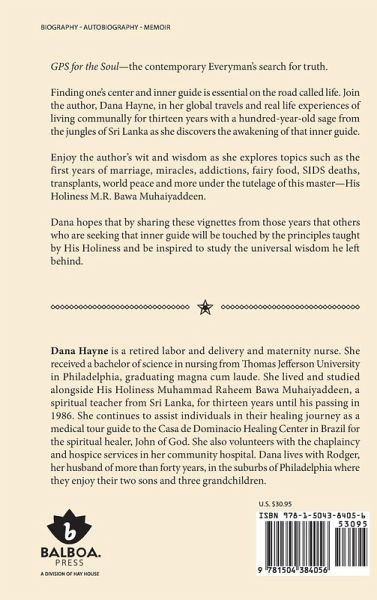 GPS for the Soul-the contemporary Everyman's search for truth. Finding one's center and inner guide is essential on the road called life. Join the author, Dana Hayne, in her global travels and real life experiences of living communally for thirteen years with a hundred-year-old sage from the jungles of Sri Lanka as she discovers the awakening of that inner guide. Enjoy the author's wit and wisdom as she explores topics such as the first years of marriage, miracles, addictions, fairy food, SIDS deaths, transplants, world peace and more under the tutelage of this master-His Holiness M.R. Bawa Muhaiyaddeen. Dana hopes that by sharing these vignettes from those years that others who are seeking that inner guide will be touched by the principles taught by His Holiness and be inspired to study the universal wisdom he left behind.