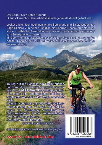 Der Edge + Du = Echte FreundeGlaubst Du nicht? Dann ist dieses Buch genau das Richtige für Dich.Locker und einfach beginnen wir die Bedienung und Einstellungen des Edge Explore 2 in seiner Funktion als Fahrrad-"Tacho" zu entdecken sowie zusätzliche Anwendungen bei einer bestehenden Verbindung zum Smartphone zu nutzen.Mit dem Thema zur Navigation beschäftigen wir uns in einem separaten Kapitel. Darin zeige ich Dir mit welchen Einstellungen diese im Edge angewandt wird. Touren auf die Schnelle am Handy suchen und zum Edge senden? Das und vieles mehr wird Dir als GPS-Einsteiger leicht verständlich erklärt. Eine umfangreiche Bebilderung zeigt stets wie es in der Praxis aussehen sollte.Natürlich sehen wir uns auch die detaillierte Tourenplanung am PC sowie die Möglichkeiten zur Auswertung, Verwaltung und Nachbearbeitung Deiner aufgezeichneten GPS- und Fitnessdaten an. Am Ende wirst Du ihn mögen - Deinen Edge Explore 2(PC-Anleitung für Windows-Nutzer bestens geeignet, Mac mit Abweichungen)