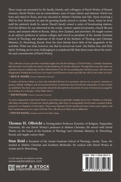 These essays are presented by the family, friends, and colleagues of David Worley of blessed memory. David Worley was an extraordinary man of many talents and interests. David was born and raised in Texas, and was educated at Abilene Christian and Yale. Upon receiving a PhD in New Testament, he and his growing family moved to Austin, Texas, where he lived until his untimely death by cancer. David's family owned a series of broadcasting stations. Over his lifetime he was interested in the media, venture capital investments, church life and music, and mission efforts in Russia, Africa, New Zealand, and elsewhere. He taught courses as an adjunct professor at various colleges and served as president of the Austin Graduate School of Theology and chairman of the board of the Institute of Theology and Christian Ministry, St. Petersburg, Russia. Even his close friends knew little of the magnitude of his activities. What was clear, however, was that he served one Lord--the Father, Son, and Holy Spirit. Nothing can be more challenging to a complacent life than these essays about the activities and commitments of David Worley.