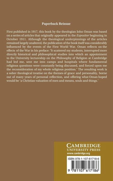 First published in 1917, this book by the theologian John Oman was based on a series of articles that originally appeared in the Expositor beginning in October 1911. Although the theological underpinnings of the articles remained largely unaltered, the publication of the book itself was considerably influenced by the events of the First World War. Oman reflects on the effects of the war in his preface: 'It scattered my students, interrupted more directly historical and philosophical studies into which an appointment to the University lectureship on the Philosophy of Religion at Cambridge had led me, sent me into camps and hospitals where fundamental religious questions were constantly being discussed, and forced upon me the reconsideration of my whole religious position.' The resulting work is a sober theological treatise on the themes of grace and personality, borne out of many years of personal reflection, and offering what Oman hoped would be 'a Christian valuation of men and means, souls and things'.