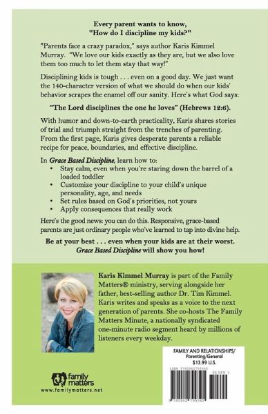 Karis Kimmel Murray is the oldest daughter of Christian relationship expert and bestselling, award winning author Dr. Tim Kimmel. Karis grew up in the family that was the proving ground for the philosophy that turned traditional Christian parenting advice on its head. Her parent's radical message has helped transform relationships in tens of thousands of Christian families through her father's book, Grace Based Parenting®, as well as the Grace-Based Parenting (TM) and Grace-Filled Marriage training events and video studies. Her debut book, Grace Based Discipline, builds on her family heritage and insider authority to shed light on what radical, grace-based discipline looks like in a Gospel-centered home. Her step-by-step, grace-based approach to discipline empowers parents to be at their best, even when their kids are at their worst. As the Creative Director for Family Matters® (the ministry behind the "grace message",) Karis writes and speaks to a growing global audience to testify to the powerful influence grace-based parenting had on her upbringing, and as a parent now herself, why she and her husband are raising their daughters the same way. With conversational style and humor, Karis connects with her readers and audiences on a heart level and swaps stories of trial and triumph...straight from the trenches of parenting. Karis is the writer and co-host of the Family Matters Minute, a daily, one-minute radio segment heard by nearly 4.5 Million people every weekday. Karis and her husband Mike reside in Scottsdale, Arizona with their two teenage daughters and a menagerie of pets.