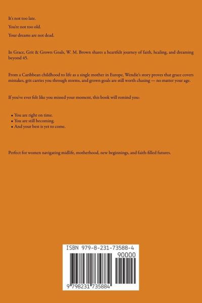 It's not too late. You're not too old. Your dreams are not dead. In Grace, Grit & Grown Goals, W. M. Brown shares a heartfelt journey of faith, healing, and dreaming beyond 45. From a Caribbean childhood to life as a single mother in Europe, Wendie's story proves that grace covers mistakes, grit carries you through storms, and grown goals are still worth chasing - no matter your age. If you've ever felt like you missed your moment, this book will remind you: You are right on time. You are still becoming. And your best is yet to come. Perfect for women navigating midlife, motherhood, new beginnings, and faith-filled futures.