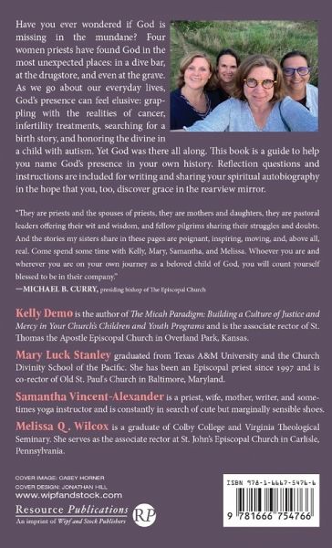 ""These stories are poignant, inspiring, moving and, above all, real."" --Michael Curry Have you ever wondered if God is missing in the mundane? Four women priests have found God in the most unexpected places: in a dive bar, at the drugstore, and even at the grave. As we go about our everyday lives, the divine can feel elusive: grappling with the realities of cancer, infertility treatments, searching for a birth story, and honoring the divine in a child with autism. Yet God was there all along. This book is a guide to help you name God's presence in your own history. Reflection questions and instructions are included for writing and sharing your spiritual autobiography in the hope that you, too, discover grace in the rearview mirror.
