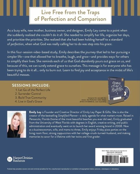 Learn to let go of your daily toil towards perfection and fall into the lasting freedom of God's grace. As a wife, new mother, business owner, and designer, Emily Ley reached a point when she suddenly realized she couldn't do it all. She needed to simplify her life, organize her days, and prioritize her priorities. She realized that she had been holding herself to a standard of perfection, when what God was really calling her to do was accept the welcoming embrace of his grace. In this four-session video-based study (DVD/video streaming sold separately), Emily--author of A Simplified Life--describes the journey that led to her pursuing a life that allowed her to breathe, laugh, and grow. Along the way, she'll take you and your group through strategies to simplify your lives. Because God so abundantly pours out grace on us, we can surely extend grace to ourselves! This message is for anyone who has been trying to do it all...only to feel like you're burning out. Learn to find joy, acceptance, and clarity in the midst of life's beautiful messes. Sessions include: 1. Let Go of the Perfect Life 2. Surrender Control 3. Build True Community 4. Live in God's Grace Designed for use with the Grace, Not Perfection Video Study (sold separately).