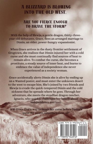 A blizzard is blowing into the Old West. With the help of Slewja, a gentle dragon, thirty-three-year-old debutante, Grace, flees an arranged marriage to Dimin, an older, power-hungry expansionist. When Grace arrives in the dusty frontier settlement of Grogtown, she realizes that Dimin injured her with a cold curse and she must continually find sources of heat to remain alive. To combat the curse, she becomes a prostitute, a steady source of inner heat, and learns to embrace the value of independence she never experienced as a society woman. Grace accidentally alerts Dimin she is alive by ending up on a Wanted poster, and must enter the unknown desert to the west to escape him. She's joined by two friends and Slewja to evade the quick-tempered Dimin and the cold sickness that he spreads where he goes. Through her adventure, she meets the steadfast dragon rancher, Ignacio, who quickly challenges her beliefs about independence and love. Will Grace find a way to break her curse before Dimin's quest for power consumes them all? Perfect for readers who love brazen female protagonists and romantic backdrops, and for fans of DONE AND DUSTED by Lyla Sage, HIS MAJESTY'S DRAGON by Naomi Novik, LEDGE by Stacey McEwan, TOGETHER WE BURN by Isabel Ibanez, and HEARTLESS by Elsie Silver.