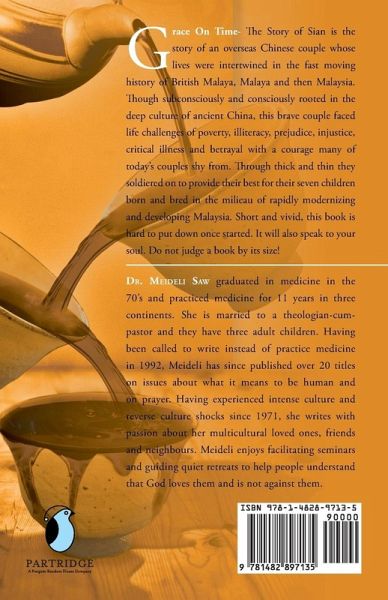 GRACE ON TIME is the story of about three generations of overseas Chinese women whose lives were intertwined in the fast moving history of British Malaya, independent Malaya and Malaysia. Though subconsciously and consciously rooted in the deep traditions of ancient China, these women faced life challenges of poverty, illiteracy, prejudice , injustice, critical illness, betrayal of marital vows and changing cultures with a commitment to their families which is becoming rare in today's global communities. Do not charge a book by its size. This short and vividly written book is hard to put down once reading commences. It may also speak to your soul.