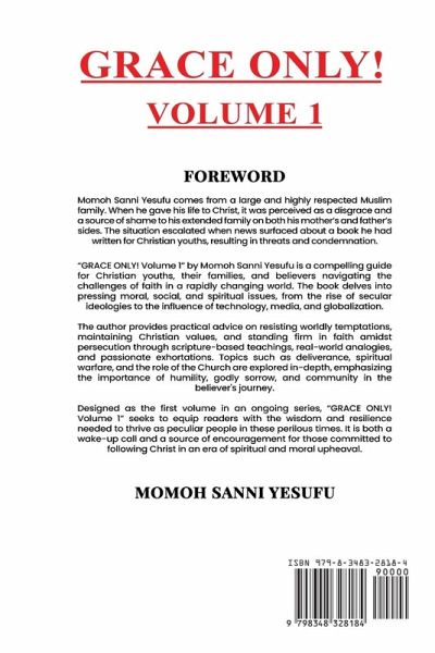 Momoh Sanni Yesufu comes from a large and highly respected Muslim family. When he gave his life to Christ, it was perceived as a disgrace and a source of shame to his extended family on both his mother's and father's sides. The situation escalated when news surfaced about a book he had written for Christian youths, resulting in threats and condemnation. "GRACE ONLY! Volume 1" by Momoh Sanni Yesufu is a compelling guide for Christian youths, their families, and believers navigating the challenges of faith in a rapidly changing world. The book delves into pressing moral, social, and spiritual issues, from the rise of secular ideologies to the influence of technology, media, and globalization. The author provides practical advice on resisting worldly temptations, maintaining Christian values, and standing firm in faith amidst persecution through scripture-based teachings, real-world analogies, and passionate exhortations. Topics such as deliverance, spiritual warfare, and the role of the Church are explored in-depth, emphasizing the importance of humility, godly sorrow, and community in the believer's journey. Designed as the first volume in an ongoing series, "GRACE ONLY! Volume 1" seeks to equip readers with the wisdom and resilience needed to thrive as peculiar people in these perilous times. It is both a wake-up call and a source of encouragement for those committed to following Christ in an era of spiritual and moral upheaval.