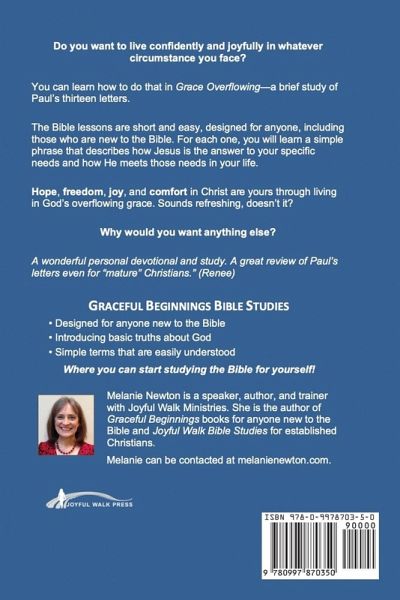 Do you want to live confidently and joyfully in whatever circumstance you face? You can learn how to do that in Grace Overflowing-a brief study of Paul's thirteen letters. The Bible lessons are short and easy, designed for anyone, including those who are new to the Bible. For each one, you will learn a simple phrase that describes how Jesus is the answer to your specific needs and how He meets those needs in your life. Hope, freedom, joy, and comfort in Christ are yours through living in God's overflowing grace. Sounds refreshing, doesn't it? Why would you want anything else?