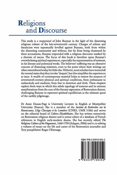This study is a reappraisal of John Bunyan in the light of the dissenting religious culture of the late-seventeenth century. Charges of schism and fanaticism were repeatedly levelled against Bunyan, both from within the dissenting community and without, but far from being chastened by these accusations, Bunyan responded with a religious discourse marked by a rhetoric of excess. The focus of this book is therefore upon Bunyan's overwhelming spiritual experiences, especially the representation of torment, in his literary and polemical works. The believers' suffering was an obsessive concern of dissenting ministers, even to the point where their writings are often remembered today for little else. Hitherto, most scholars have termed all the mental states that they invoke 'despair', but this simplifies the experiences at issue. A wealth of contemporary material helps to restore the nuances of seventeenth-century physical and spiritual conditions, from enthusiasm to melancholy and madness; from fear to desertion and sloth. These chapters explore fresh ways in which this subtle typology of torment and its extreme manifestations form the core of the literary expression of Restoration dissent, challenging Bunyan to represent spiritual equilibrium as the ultimate quest of the earthly pilgrimage.