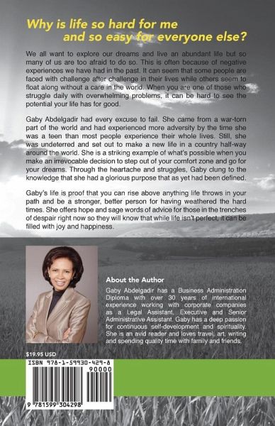 Why is life so hard for me and so easy for everyone else? We all want to explore our dreams and live an abundant life but so many of us are too afraid to do so. This is often because of negative experiences we have had in the past. It can seem that some people are faced with challenge after challenge in their lives while others seem to fl oat along without a care in the world. When you are one of those who struggle daily with overwhelming problems, it can be hard to see the potential your life has for good. Gaby Abdelgadir had every excuse to fail. She came from a war-torn part of the world and had experienced more adversity by the time she was a teen than most people experience their whole lives. Still, she was undeterred and set out to make a new life in a country half-way around the world. She is a striking example of what's possible when you make an irrevocable decision to step out of your comfort zone and go for your dreams. Through the heartache and struggles, Gaby clung to the knowledge that she had a glorious purpose that as yet had been defined. Gaby's life is proof that you can rise above anything life throws in your path and be a stronger, better person for having weathered the hard times. She offers hope and sage words of advice for those in the trenches of despair right now so they will know that while life isn't perfect, it can be filled with joy and happiness. About the Author Gaby Abdelgadir has a Business Administration Diploma with over 30 years of international experience working with corporate companies as a Legal Assistant, Executive and Senior Administrative Assistant. Gaby has a deep passion for continuous self-development and spirituality. She is an avid reader and loves travel, art, writing and spending quality time with family and friends.
