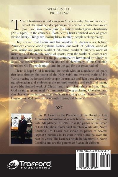 WHAT IS THE PROBLEM? True Christianity is under siege in America today! Satan has spread two of the most evil deceptions in his arsenal, secular humanism [No - God] in our society and institutions and religious Christianity [No -- Spirit] in the churches. Both deny Christ's finished work of grace (divine favor). Things are looking bleak to many people seeking reality! They realize that Satan and his kingdom of darkness are behind America's chaotic world systems. Notice, our world of politics, world of social action and justice, world of education, world of finances, world of marriage and the family, world of sports, even the world of weather are distorted and corrupted. For the past century, we have stood by blindly as Satan has secularized our society and religionized many of our Christian churches. God's people must stand in the gap for this great nation! There is hope! God is meeting the needs with abundance of living grace, through the restored power of the Holy Spirit and restored truths of His Word; making leaders and their people the true salt and light through inward transformation and embracing the restored teaching and reality of living grace [the finished work of Christ], and right relationships in Him. Thus, God is rising up anointed Para-ministries among professing Christians; and churches who are hearing what the Spirit is saying to the churches. Nothing is too hard for God!