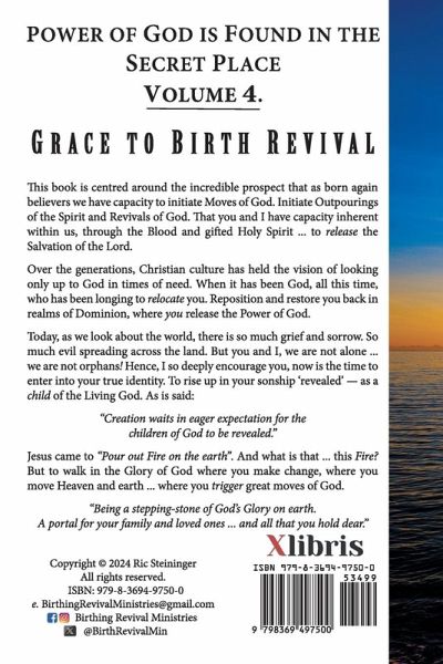 POWER OF GOD IS FOUND IN THE SECRET PLACE VOLUME 4. G R A C E T O B I R T H R E V I V A L This book is centred around the incredible prospect that as born again believers we have capacity to initiate Moves of God. Initiate Outpourings of the Spirit and Revivals of God. That you and I have capacity inherent within us, through the Blood and gifted Holy Spirit ... to release the Salvation of the Lord. Over the generations, Christian culture has held the vision of looking only up to God in times of need. When it has been God, all this time, who has been longing to relocate you. Reposition and restore you back in realms of Dominion, where you release the Power of God. Today, as we look about the world, there is so much grief and sorrow. So much evil spreading across the land. But you and I, we are not alone ... we are not orphans! Hence, I so deeply encourage you, now is the time to enter into your true identity. To rise up in your sonship 'revealed' - as a child of the Living God. As is said: "Creation waits in eager expectation for the children of God to be revealed." Jesus came to "Pour out Fire on the earth". And what is that ... this Fire? But to walk in the Glory of God where you make change, where you move Heaven and earth ... where you trigger great moves of God. "Being a stepping-stone of God's Glory on earth. A portal for your family and loved ones ... and all that you hold dear." Copyright (c) 2025 Ric Steininger All rights reserved. ISBN: 000-0-000000-0-0 e. BirthingRevivalMinistries@gmail.com Birthing Revival Ministries @BirthRevivalMin