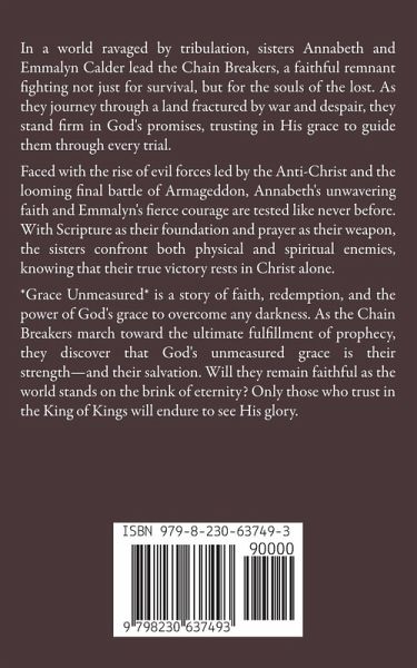 In a world ravaged by tribulation, sisters Annabeth and Emmalyn Calder lead the Chain Breakers, a faithful remnant fighting not just for survival, but for the souls of the lost. As they journey through a land fractured by war and despair, they stand firm in God's promises, trusting in His grace to guide them through every trial. Faced with the rise of evil forces led by the Anti-Christ and the looming final battle of Armageddon, Annabeth's unwavering faith and Emmalyn's fierce courage are tested like never before. With Scripture as their foundation and prayer as their weapon, the sisters confront both physical and spiritual enemies, knowing that their true victory rests in Christ alone. *Grace Unmeasured* is a story of faith, redemption, and the power of God's grace to overcome any darkness. As the Chain Breakers march toward the ultimate fulfillment of prophecy, they discover that God's unmeasured grace is their strength-and their salvation. Will they remain faithful as the world stands on the brink of eternity? Only those who trust in the King of Kings will endure to see His glory.