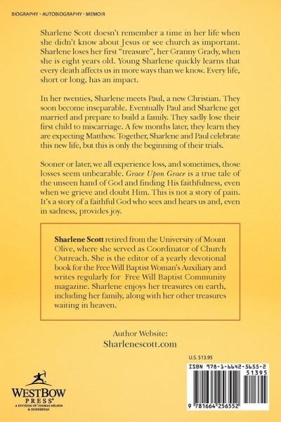 Sharlene Scott doesn't remember a time in her life when she didn't know about Jesus or see church as important. Sharlene loses her first "treasure", her Granny Grady, when she is eight years old. Young Sharlene quickly learns that every death affects us in more ways than we know. Every life, short or long, has an impact. In her twenties, Sharlene meets Paul, a new Christian. They soon become inseparable. Eventually Paul and Sharlene get married and prepare to build a family. They sadly lose their first child to miscarriage. A few months later, they learn they are expecting Matthew. Together, Sharlene and Paul celebrate this new life, but this is only the beginning of their trials. Sooner or later, we all experience loss, and sometimes, those losses seem unbearable. Grace Upon Grace is a true tale of the unseen hand of God and finding His faithfulness, even when we grieve and doubt Him. This is not a story of pain. It's a story of a faithful God who sees and hears us and, even in sadness, provides joy.