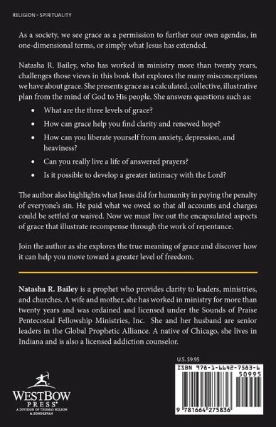 As a society, we see grace as a permission to further our own agendas, in one-dimensional terms, or simply what Jesus has extended. Natasha R. Bailey, who has worked in ministry more than twenty years, challenges those views in this book that explores the many misconceptions we have about grace. She presents grace as a calculated, collective, illustrative plan from the mind of God to His people. She answers questions such as: What are the three levels of grace? How can grace help you find clarity and renewed hope? How can you liberate yourself from anxiety, depression, and heaviness? Can you really live a life of answered prayers? Is it possible to develop a greater intimacy with the Lord? The author also highlights what Jesus did for humanity in paying the penalty of everyone's sin. He paid what we owed so that all accounts and charges could be settled or waived. Now we must live out the encapsulated aspects of grace that illustrate recompense through the work of repentance. Join the author as she explores the true meaning of grace and discover how it can help you move toward a greater level of freedom.