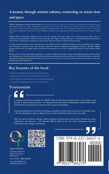 In a rapidly evolving world, where ancient traditions and cultural knowledge are increasingly at risk of being forgotten, GRACE: Timekeepers of Ancient Cultural Legacy takes readers on an extraordinary journey through the efforts to safeguard humanity's most precious heritage. Born from the visionary minds behind the Advocacy Unified Network (AUN) and headquartered in Santipur, West Bengal, GRACE (Global Repository for Ancient Cultural Endeavours) stands as a beacon of hope in the realm of cultural preservation. This groundbreaking initiative, originally conceived in The Hague, Netherlands, aims to protect and promote ancient cultural traditions, artifacts, and knowledge systems for future generations. This book delves deep into the critical importance of preserving ancient cultural heritage in the face of mounting global challenges such as urbanization, climate change, and conflicts. From exploring the profound threats that jeopardize historical sites and traditional practices to highlighting the latest technologies, including AI-driven tools, 3D scanning, and virtual reality, GRACE: Timekeepers of Ancient Cultural Legacy presents a comprehensive and innovative approach to cultural preservation. Through a richly woven narrative, the book unpacks GRACE's founding mission, its strategic global presence, and its commitment to interdisciplinary research and education initiatives. Readers will discover how GRACE collaborates with governments, NGOs, cultural institutions, and local communities across the world to champion the cause of heritage protection. From digital archiving methods to successful case studies of community-led preservation projects, the book offers inspiring examples of how ancient legacies are being preserved with a forward-thinking approach. The book also sheds light on GRACE's role in shaping international cultural policies, lobbying efforts, and public awareness campaigns. With an emphasis on global collaboration, GRACE showcases the successes and challenges faced in building an interconnected, international network of cultural advocates. It addresses ethical questions about cultural ownership, intellectual property rights, and the restitution of artifacts while offering solutions to the delicate balance between cultural preservation and autonomy. Authored by a dedicated young team under the mentorship of global cultural experts, this book serves as a testament to their commitment and passion for preserving the legacies of the past. Dr. Rajendran Govender from Durban, South Africa, plays a pivotal role in guiding GRACE, sharing his vast experience to mentor the organization as it grows into the global force it was dreamt to be. At its core, GRACE: Timekeepers of Ancient Cultural Legacy is more than a call to action-it is a compelling vision for the future of cultural preservation. It challenges readers to rethink the ways in which heritage can be safeguarded, not only through traditional means but through the lens of modern technology and global cooperation. As GRACE continues to evolve, this book invites the world to take part in the mission to protect and celebrate humanity's shared cultural treasures. Perfect for global readers, cultural enthusiasts, historians, policymakers, and advocates, this book is a must-read for anyone invested in the future of cultural preservation. With a blend of intellectual rigor, inspiring stories, and practical solutions, GRACE: Timekeepers of Ancient Cultural Legacy positions itself as a crucial resource for those looking to make an impact in protecting the rich diversity of ancient cultures across the world.
