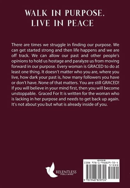 There are times we struggle in finding our purpose. We can get started strong and then life happens and we are off track. We can allow our past and other people's opinions to hold us hostage and paralyze us from moving forward in our purpose. Every woman is GRACED to do at least one thing. It doesn't matter who you are, where you live, how dark your past is, how many followers you have or don't have. None of that matters. You are still GRACED! If you will believe in your mind first, then you will become unstoppable. Graced For It is written for the woman who is lacking in her purpose and needs to get back up again. It's not about you but what is already inside of you.