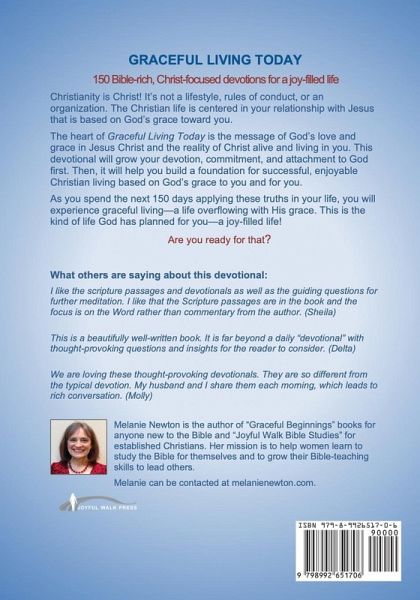 Are you enjoying the life God has planned for you? Do you even know what that is? In Graceful Living Today, you will learn why God's grace to you offers you the best life you can possibly ever live. You will get a firm grasp on who Christ is and why that is important. You will understand what He accomplished on the cross for you that makes a difference today. You will appreciate the new life He offers to you. The 150-day devotions are Bible-rich and Christ-focused rather than filled with commentary. All the Bible verses referenced are included in the book. Graceful Living Today is a short and easy adaptation of our Graceful Living study used by women around the world. The Graceful Living Today content will help you recognize the lies drawing you away from God and down into misery. You will learn how to live fully in the power of God's Spirit indwelling you. Bask in God's love for you and the new identity He gives to you. Don't wait! Spend the next days of your life learning how to enjoy the fulfilling life God has planned for you because of His grace toward you. Are you ready for that kind of life? Get Graceful Living Today and experience a joy-filled life!