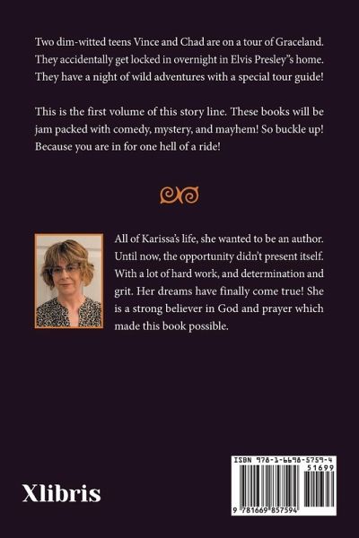 This comedy adventure book is about when two dim-witted teen boys get themselves accidentally locked in Graceland overnight while on a tour of the home of Elvis Presley, The King Of Rock And Roll! This is the first volume of this storyline. Together, we will go on an amazing roller coaster ride along the main characters, Vince and Chad! These books will be jam packed pack with laughs, adventure, and all kinds of MAYHEM! so my eager reader! Buckle up! cause you're about to take one HELL OF A RIDE!!