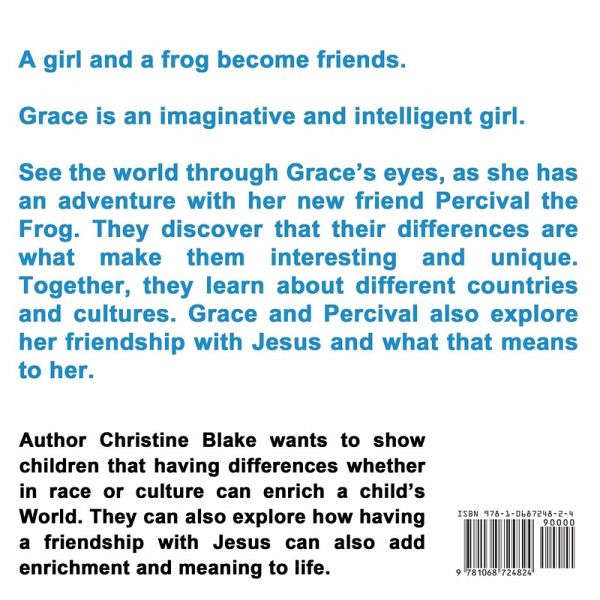 In this children's book, a girl and a frog become friends. Grace is an imaginative and intelligent girl. See the world through Grace's eyes, as she has an adventure with her new friend Percival the Frog. They discover that their differences are what make them interesting and unique. Together, they learn about different countries and cultures. Grace and Percival also explore her friendship with Jesus and what that means to her. Foreword from Gina Lewis Bachelor of Arts, MSC Social Work, BA English, Master of Science: "I have known the author Christine for many years. I was asked to read Graces Adventures and to give my opinion of the book. I found it very comforting reading this book. The interaction between Grace and Percival the frog is multifaceted. They converse about faith in God. They discuss Percival's concerns about his appearance. Grace and Percival identify the things that make them different and unique. Their travels to Jamaica to see the beauty and understand the culture of that land gives children insight about a country different from their own. All in all, this is a great book and I can envision children enjoying reading it very much."
