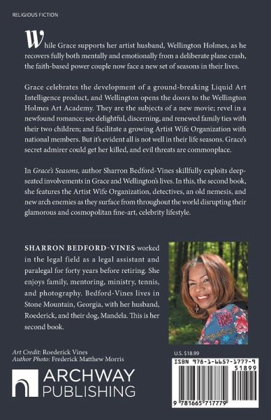 While Grace supports her artist husband, Wellington Holmes, as he recovers fully both mentally and emotionally from a deliberate plane crash, the faith-based power couple now face a new set of seasons in their lives. Grace celebrates the development of a ground-breaking Liquid Art Intelligence product, and Wellington opens the doors to the Wellington Holmes Art Academy. They are the subjects of a new movie; revel in a newfound romance; see delightful, discerning, and renewed family ties with their two children; and facilitate a growing Artist Wife Organization with national members. But it's evident all is not well in their life seasons. Grace's secret admirer could get her killed, and evil threats are commonplace. In Grace's Seasons, author Sharron Bedford-Vines skillfully exploits deep-seated involvements in Grace and Wellington's lives. In this, the second book, she features the Artist Wife Organization, detectives, an old nemesis, and new arch enemies as they surface from throughout the world disrupting their glamorous and cosmopolitan fine-art, celebrity lifestyle.