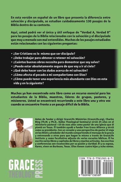 En esta versión en español de un libro que presenta la diferencia entre salvación y discipulado, se estudian cuidadosamente 130 pasajes de la Biblia dentro de su contexto. Aquí, usted podrá ver el único y útil enfoque de "Verdad A, Verdad B" para los pasajes de la Biblia relacionados con la salvación y el discipulado que muy a menudo son mal entendidos. Muchos de los pasajes estudiados están relacionados con las siguientes preguntas: ¿Ser Cristiano es lo mismo que ser discípulo? ¿Debo trabajar para obtener o retener mi salvación? ¿Cuántas buenas obras necesito para demostrar que soy salvo? ¿Puedo estar absolutamente seguro de que voy a ir al cielo? ¿Qué debo hacer con las dudas acerca de mi salvación? ¿Cómo afecta el pecado a mi compañerismo con Dios? ¿Cómo puedo tener una experiencia más abundante con Dios en esta vida y en la siguiente? Muchos ya han encontrado este libro como un recurso esencial para los estudiantes de la Biblia, maestros, líderes de grupos, pastores, y misioneros. Usted se encontrará recurriendo a este libro una y otra vez cuando se encuentre frente a un pasaje difícil de la Biblia.