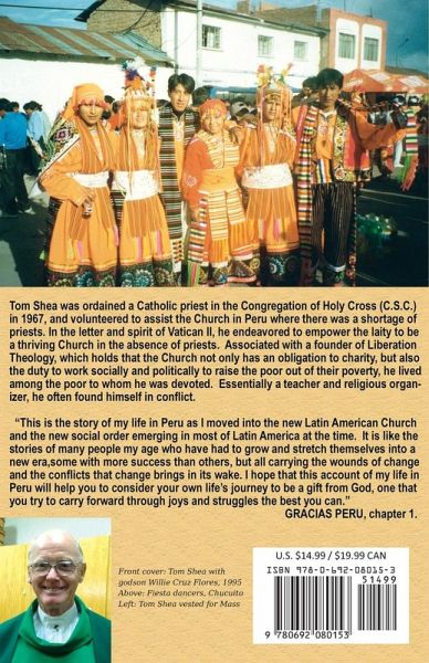 Tom Shea was ordained a Catholic priest in the Congregation of Holy Cross (C.S.C.) in 1967, and volunteered to assist the Church in Peru where there was a shortage of priests. In the letter and spirit of Vatican II, he endeavored to empower the laity to be a thriving Church in the absence of priests. Associated with a founder of Liberation Theology, which holds that the Church not only has an obligation to charity, but also the duty to work socially and politically to raise the poor out of their poverty, he lived among the poor to whom he was devoted. Essentially a teacher and religious organizer, he often found himself in conflict. "This is the story of my life in Peru as I moved into the new Latin American Church and the new social order emerging in most of Latin America at the time. It is like the stories of many people my age who have had to grow and stretch themselves into a new era, some with more success than others, but all carrying the wounds of change and the conflicts that change brings in its wake. I hope that this account of my life in Peru will help you to consider your own life's journey to be a gift from God, one that you try to carry forward through joys and struggles the best you can." GRACIAS PERÚ, chapter 1.