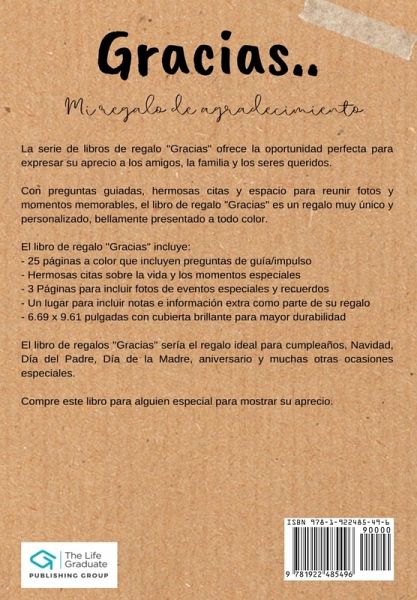 La serie de libros de regalo "Gracias" ofrece la oportunidad perfecta para expresar su aprecio a los amigos, la familia y los seres queridos. Con preguntas guiadas, hermosas citas y espacio para reunir fotos y momentos memorables, el libro de regalo "Gracias" es un regalo muy único y personalizado, bellamente presentado a todo color. El libro de regalo "Gracias" incluye: - 25 páginas a color que incluyen preguntas de guía/impulso - Hermosas citas sobre la vida y los momentos especiales - 3 Páginas para incluir fotos de eventos especiales y recuerdos - Un lugar para incluir notas e información extra como parte de su regalo - 6.69 x 9.61 pulgadas con cubierta brillante para mayor durabilidad El libro de regalos "Gracias" sería el regalo ideal para cumpleaños, Navidad, Día del Padre, Día de la Madre, aniversario y muchas otras ocasiones especiales. Compre este libro para alguien especial para mostrar su aprecio.