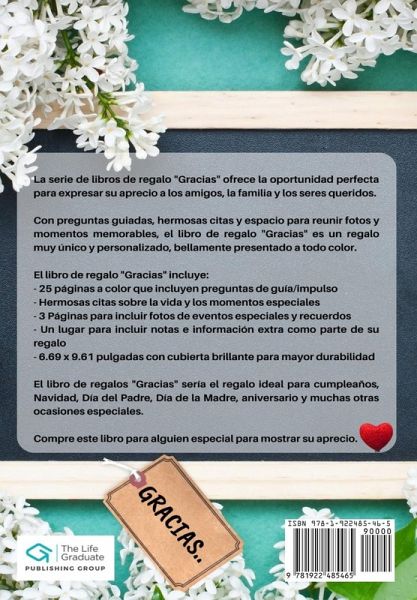 La serie de libros de regalo "Gracias" ofrece la oportunidad perfecta para expresar su aprecio a los amigos, la familia y los seres queridos. Con preguntas guiadas, hermosas citas y espacio para reunir fotos y momentos memorables, el libro de regalo "Gracias" es un regalo muy único y personalizado, bellamente presentado a todo color. El libro de regalo "Gracias" incluye: - 25 páginas a color que incluyen preguntas de guía/impulso - Hermosas citas sobre la vida y los momentos especiales - 3 Páginas para incluir fotos de eventos especiales y recuerdos - Un lugar para incluir notas e información extra como parte de su regalo - 6.69 x 9.61 pulgadas con cubierta brillante para mayor durabilidad El libro de regalos "Gracias" sería el regalo ideal para cumpleaños, Navidad, Día del Padre, Día de la Madre, aniversario y muchas otras ocasiones especiales. Compre este libro para alguien especial para mostrar su aprecio.