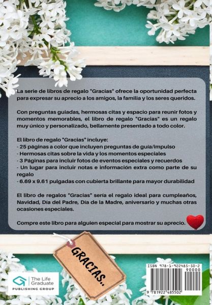 La serie de libros de regalo "Gracias" ofrece la oportunidad perfecta para expresar su aprecio a los amigos, la familia y los seres queridos. Con preguntas guiadas, hermosas citas y espacio para reunir fotos y momentos memorables, el libro de regalo "Gracias" es un regalo muy único y personalizado, bellamente presentado a todo color. El libro de regalo "Gracias" incluye: - 25 páginas a color que incluyen preguntas de guía/impulso - Hermosas citas sobre la vida y los momentos especiales - 3 Páginas para incluir fotos de eventos especiales y recuerdos - Un lugar para incluir notas e información extra como parte de su regalo - 6.69 x 9.61 pulgadas con cubierta brillante para mayor durabilidad El libro de regalos "Gracias" sería el regalo ideal para cumpleaños, Navidad, Día del Padre, Día de la Madre, aniversario y muchas otras ocasiones especiales. Compre este libro para alguien especial para mostrar su aprecio.