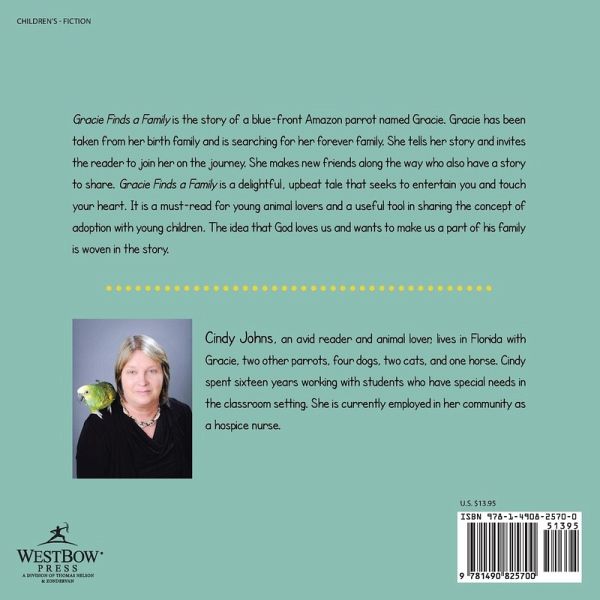 Gracie Finds a Family is the story of a blue-front Amazon parrot named Gracie. Gracie has been taken from her birth family and is searching for her forever family. She tells her story and invites the reader to join her on the journey. She makes new friends along the way who also have a story to share. Gracie Finds a Family is a delightful, upbeat tale that seeks to entertain you and touch your heart. It is a must-read for young animal lovers and a useful tool in sharing the concept of adoption with young children. The idea that God loves us and wants to make us a part of his family is woven in the story.