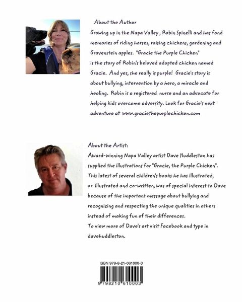 Gracie was a new chick in the coop, adopted by the Farmer and Champ the Dog. Being different, Gracie was often pushed around by the other hens. Gracie was self conscious because she had ordinary feathers and was clumsy. One day, Miss Bossy Pants and the other hens surrounded Gracie and began pecking her with mean words. Champ the Dog intervened. That night, Gracie has a dream and receives a crown and a purple mantle. When she awakes, Gracie feels different. Gracie flaps her purple feathers and flies to the top of the hen house where she can see vineyards, sunflowers and amazing things. Gracie smiles and waves at Miss Bossy Pants and to Gracie's surprise, Miss Bossy Pa nts waves back! Gracie the Purple Chicken and Champ start a friendship club called "Champions" to end bullying and promote friendship. Follow @Graciethepurplechicken on FaceBook and Instagram. Read about the Author's inspiration in VoyageAustin Magazine August 2022, under Hidden Gems. Gracie's newest book, "Gracie the Purple Chicken, Adopted and Loved" is now available on Amazon and other online bookstores.