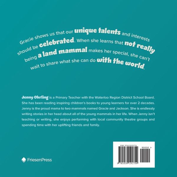 Gracie shows us that our unique talents and interests should be celebrated. When she learns that not really being a land mammal makes her special, she can't wait to share what she can do with the world.