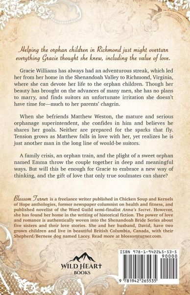 Helping the orphan children in Richmond just might overturn everything Gracie thought she knew, including the value of love. Gracie Williams has always had an adventurous streak, which led her from her home in the Shenandoah Valley to Richmond, Virginia, where she can devote her life to the orphan children. Though her beauty has brought on the advances of many men, she has no plans to marry, and finds suitors an unfortunate irritation she doesn't have time for-much to her parents' chagrin. When she befriends Matthew Weston, the mature and serious orphanage superintendent, she confides in him and believes he shares her goals. Neither are prepared for the sparks that fly. Tension grows as Matthew falls in love with her, yet realizes he is just another man in the long line of would-be suitors. A family crisis, an orphan train, and the plight of a sweet orphan named Emma throw the couple together in deep and meaningful ways. But will this be enough for Gracie to embrace a new way of thinking, and the gift of love that only true soulmates can share?