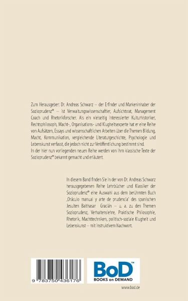 Graciáns Handbuch der Sozioprudenz® ist der dritte Band einer neuen innovativen Reihe: Lehrbücher und Klassiker der Sozioprudenz®.Sozioprudenz® ist ein fundiertes, von Dr. Andreas Schwarz entwickeltes und rechtlich geschütztes Lehr- und Beratungskonzept, daß es ermöglicht, alle Lebenssituationen mit souveräner Klugheit und Kompetenz zu lösen. Die Sozioprudenz® hat Dr. Schwarz im Rahmen einer langen - eigentlich als Habilitationsschrift gedachten - Arbeit seit Beginn des neuen Jahrtausends als Ausdruck für eine politisch-soziale Klugheitslehre erfunden. Die Klugheit in allen Situationen angemessen agieren und reagieren zu können, gehörte einst zur Bildung der gesellschaftlichen Oberschichten. Heute da alle Bildung sich weitgehend auf Ausbildung konzentriert, findet diese Art der Bildung nicht mehr statt. Die Kunst der Sozioprudenz ist darum weitgehend verloren gegangen. Das gleichwohl auch heute vorhandene Bedürfnis nach kompetenter Beratung in dem wichtigen Feld persönlicher und beruflicher Klugheit ist in die vielfach zu simplen Ratgeber mit ihren technischen 'Checklisten' abgewandert. Galten Klugheit und Rhetorik einst als unabdingbare Kenntnisse und Kompetenzen für ein gelingendes und erfolgreiches Leben, so sind sie jetzt in der akademischen Betriebswirtschaftslehre wie auch in der universitären Philosophie fast vollständig vergessen oder gelten nur als mindere (unwissenschaftliche) Form des Denkens. Rhetorik und Weltklugheit gehören aber - trotz dieses Vergessens - noch immer zum Schatz des (elitären) Grundlagenwissens bei zwischenmenschlichen und gesellschaftlichen Lebensvorgängen.Dieses doch so wichtige Wissen und Können lehrt Sie die Sozioprudenz®.In diesem Band finden Sie in der von Dr. Andreas Schwarz herausgegebenen Reihe Lehrbücher und Klassiker der Sozioprudenz® eine Auswahl aus dem berühmten Buch 'Oráculo manual y arte de prudencia' des spanischen Jesuiten Balthasar Gracián - u. a. zu den Themen Sozioprudenz, Verhaltenslehre, Praktische Philosophie, Rhetorik, Machttechniken, politisch-soziale Klugheit und Lebenskunst - mit instruktivem Nachwort.Mit den besten Empfehlungen für Ihren Erfolg - vom Erfinder der Sozioprudenz!