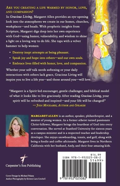 Are you creating a life warmed by honor, love, and compassion? Or are you caught up in a ¿do for all until you hit the wall¿ atmosphere? Maybe your life is chaos central¿or just the opposite¿strictly glued to the high-control side. Perhaps, disappointments are zapping your spirit. For most women, all those atmospheres swirl. Yet, we long for centered lives full of joy, purpose, and soul-calming peace. In Gracious Living, Margaret Allen provides an eye-opening look into the atmospheres we create in our homes, churches, workplaces¿and our own heads. With prophetic insights from Scripture, Margaret digs deep into her own experience with God, using humor, raw vulnerability, and wisdom to shine light on a loving way to do life. She uses a velvet hammer to help women: * Destroy inept attempts at being pleasant. * Get down to real-deal ways to speak joy and hope into others¿and our own souls. * Embrace lives filled with honor, love, and compassion.