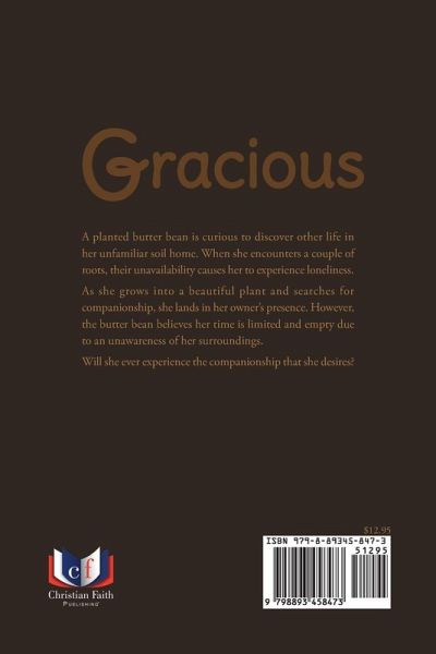 A planted butter bean is curious to discover other life in her unfamiliar soil home. When she encounters a couple of roots, their unavailability causes her to experience loneliness. As she grows into a beautiful plant and searches for companionship, she lands in her owner's presence. However, the butter bean believes her time is limited and empty due to an unawareness of her surroundings. Will she ever experience the companionship that she desires?