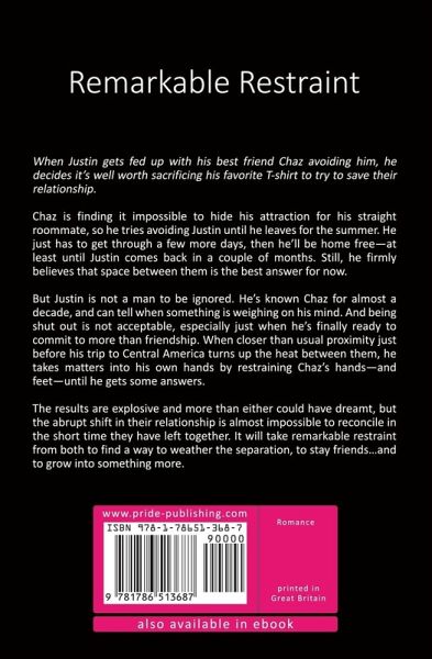 When Justin gets fed up with his best friend Chaz avoiding him, he decides it's well worth sacrificing his favorite T-shirt to try to save their relationship. Chaz is finding it impossible to hide his attraction for his straight roommate, so he tries avoiding Justin until he leaves for the summer. He just has to get through a few more days, then he'll be home free-at least until Justin comes back in a couple of months. Still, he firmly believes that space between them is the best answer for now. But Justin is not a man to be ignored. He's known Chaz for almost a decade, and can tell when something is weighing on his mind. And being shut out is not acceptable, especially just when he's finally ready to commit to more than friendship. When closer than usual proximity just before his trip to Central America turns up the heat between them, he takes matters into his own hands by restraining Chaz's hands-and feet-until he gets some answers. The results are explosive and more than either could have dreamt, but the abrupt shift in their relationship is almost impossible to reconcile in the short time they have left together. It will take remarkable restraint from both to find a way to weather the separation, to stay friends...and to grow into something more.