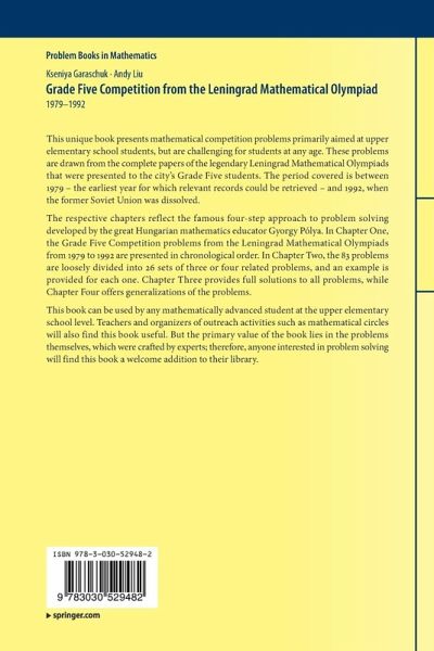 The respective chapters reflect the famous four-step approach to problem solving developed by the great Hungarian mathematics educator Gyorgy Pólya. In Chapter One, the Grade Five Competition problems from the Leningrad Mathematical Olympiads from 1979 to 1992 are presented in chronological order. In Chapter Two, the 83 problems are loosely divided into 26 sets of three or four related problems, and an example is provided for each one. Chapter Three provides full solutions to all problems, while Chapter Fouroffers generalizations of the problems.