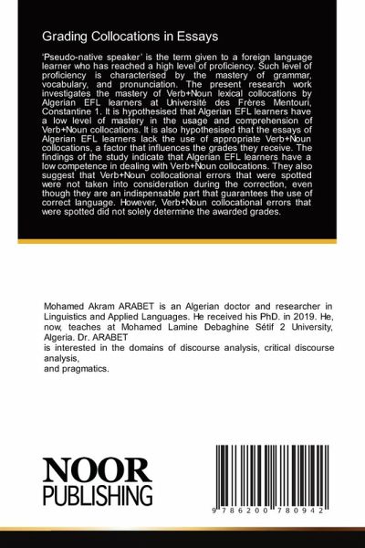 'Pseudo-native speaker' is the term given to a foreign language learner who has reached a high level of proficiency. Such level of proficiency is characterised by the mastery of grammar, vocabulary, and pronunciation. The present research work investigates the mastery of Verb+Noun lexical collocations by Algerian EFL learners at Université des Frères Mentouri, Constantine 1. It is hypothesised that Algerian EFL learners have a low level of mastery in the usage and comprehension of Verb+Noun collocations. It is also hypothesised that the essays of Algerian EFL learners lack the use of appropriate Verb+Noun collocations, a factor that influences the grades they receive. The findings of the study indicate that Algerian EFL learners have a low competence in dealing with Verb+Noun collocations. They also suggest that Verb+Noun collocational errors that were spotted were not taken into consideration during the correction, even though they are an indispensable part that guarantees the use of correct language. However, Verb+Noun collocational errors that were spotted did not solely determine the awarded grades.