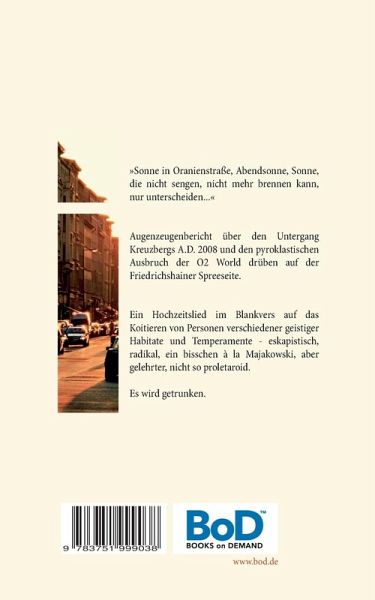 Ein bei gegebener Gelegenheit im Blankvers verfasstes Hochzeitslied auf das lehrreiche, nutzbringende und Monstren erzeugende Koitieren von Personen verschiedener geistiger Habitate und Temperamente: Psychoanalytikerin - Bibliothekar, Ossi - Wessi, maßvoll - versoffen. Der Hintergrund der Szene zeigt den katastrophalen Untergang Kreuzbergs A.D. 2008, als auf der Friedrichshainer Spreeseite die O2 World ausbrach.
