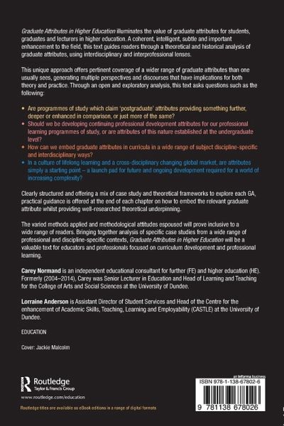 Graduate Attributes in Higher Education illuminates the value of graduate attributes for students, graduates and lecturers in higher education. A coherent, intelligent, subtle and important enhancement to the field, this text guides readers through a theoretical and historical analysis of graduate attributes, using interdisciplinary and interprofessional lenses. This unique approach offers pertinent coverage of a wider range of graduate attributes than one usually sees, generating multiple perspectives and discourses that have implications for both theory and practice. Through an open and exploratory analysis, this text asks questions such as the following: ¿ Are programmes of study which claim 'postgraduate' attributes providing something further, deeper or enhanced in comparison, or just more of the same? ¿ Should we be developing continuing professional development attributes for our professional learning programmes of study, or are attributes of this nature established at the undergraduate level? ¿ How can we embed graduate attributes in curricula in a wide range of subject discipline-specific and interdisciplinary ways? ¿ In a culture of lifelong learning and a cross-disciplinary changing global market, are attributes simply a starting point - a launch pad for future and ongoing development required for a world of increasing complexity? Clearly structured and offering a mix of case study and theoretical frameworks to explore each GA, practical guidance is offered at the end of each chapter on how to embed the relevant graduate attribute whilst providing well-researched theoretical underpinning. The varied methods applied and methodological attitudes espoused will prove inclusive to a wide range of readers. Bringing together analysis of specific case studies from a wide range of professional and discipline-specific contexts, Graduate Attributes in Higher Education will be a valuable text for educators and professionals focused on curriculum development and professional learning.