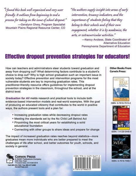 Effective dropout prevention strategies for educators! This resource offers guidelines for implementing dropout prevention strategies in the classroom and throughout the school system. The impact of increased graduation rates reaches farther than statistics-more graduates mean more individuals who are better prepared to meet the challenges of life after school, and better outcomes for youth, schools, and society in general. With the goal of producing an educated citizenry, the authors present tools and a plan for: Increasing graduation rates Meeting the standards set by the No Child Left Behind Act Pinpointing the most critical years for establishing a solid educational foundation