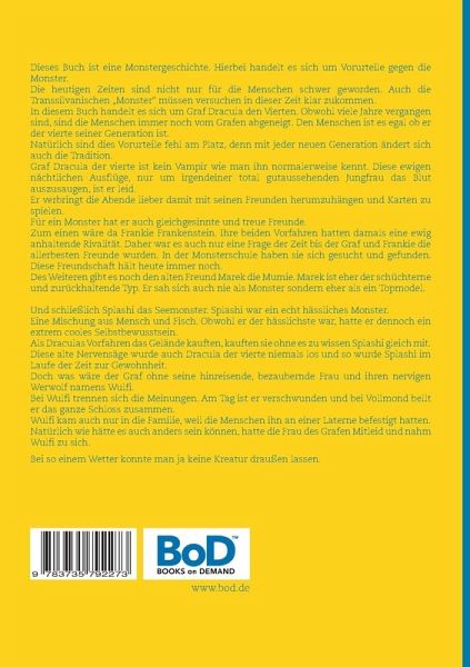 Dieses Buch ist eine Monstergeschichte. Hierbei handelt es sich um Vorurteile gegen die Monster.Die heutigen Zeiten sind nicht nur für die Menschen schwer geworden. Auch die Transsilvanischen "Monster" müssen versuchen, in dieser Zeit klar zukommen. In diesem Buch handelt es sich um Graf Dracula den Vierten. Obwohl viele Jahre vergangen sind, sind die Menschen immer noch vom Grafen abgeneigt. Den Menschen ist es egal, ob er der vierte seiner Generation ist. Natürlich sind diese Vorurteile fehl am Platz, denn mit jeder neuen Generation ändert sich auch die Tradition. Graf Dracula der vierte ist kein Vampir, wie man ihn normalerweise kennt. Diese ewigen nächtlichen Ausflüge, nur um irgendeiner total gutaussehenden Jungfrau das Blut auszusaugen, ist er leid. Er verbringt die Abende lieber damit, mit seinen Freunden herumzuhängen und Karten zu spielen. Für ein Monster hat er auch gleichgesinnte und treue Freunde. Zum einen wäre da Frankie Frankenstein. Ihre beiden Vorfahren hatten damals eine ewig anhaltende Rivalität. Daher war es auch nur eine Frage der Zeit bis der Graf und Frankie die allerbesten Freunde wurden. In der Monsterschule haben sie sich gesucht und gefunden. Diese Freundschaft hält heute immer noch. Des Weiteren gibt es noch den alten Freund Marek die Mumie. Marek ist eher der schüchterne und zurückhaltende Typ. Er sah sich auch nie als Monster, sondern eher als ein Topmodel.Und schließlich Splashi das Seemonster. Splashi war ein echt hässliches Monster. Eine Mischung aus Mensch und Fisch. Obwohl er der hässlichste war, hatte er dennoch ein extrem cooles Selbstbewusstsein. Als Draculas Vorfahren das Gelände kauften, kauften sie ohne es zu wissen Splashi gleich mit. Diese alte Nervensäge wurde auch Dracula der vierte niemals los, und so wurde Splashi im Laufe der Zeit zur Gewohnheit. Doch was wäre der Graf ohne seine hinreißende, bezaubernde Frau und ihren nervigen Werwolf namens Wulfi. Bei Wulfi trennen sich die Meinungen. Am Tag ist er verschwunden und bei Vollmond bellt er das ganze Schloss zusammen.Wulfi kam auch nur in die Familie, weil die Menschen ihn an einer Laterne befestigt hatten. Natürlich wie hätte es auch anders sein können, hatte die Frau des Grafen Mitleid und nahm Wulfi zu sich. Bei so einem Wetter konnte man ja keine Kreatur draußen lassen.