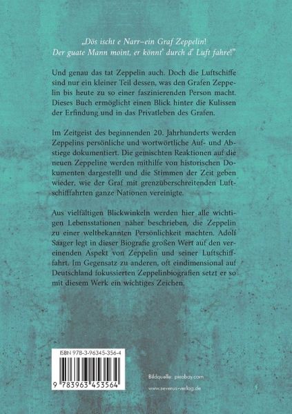 "Dös ischt e Narr-ein Graf Zeppelin! Der guate Mann moint, er könnt' durch d' Luft fahre!"Und genau das tat Zeppelin auch. Doch die Luftschiffe sind nur ein kleiner Teil dessen, was den Grafen Zeppelin bis heute zu so einer faszinierenden Person macht. Dieses Buch ermöglicht einen Blick hinter die Kulissen der Erfindung und in das Privatleben des Grafen.Im Zeitgeist des beginnenden 20. Jahrhunderts werden Zeppelins persönliche und wortwörtliche Auf- und Abstiege dokumentiert. Die gemischten Reaktionen auf die neuen Zeppeline werden mithilfe von historischen Dokumenten dargestellt und die Stimmen der Zeit geben wieder, wie der Graf mit grenzüberschreitenden Luftschifffahrten ganze Nationen vereinigte. Aus vielfältigen Blickwinkeln werden hier alle wichtigen Lebensstationen näher beschrieben, die Zeppelin zu einer weltbekannten Persönlichkeit machten. Adolf Saager legt in dieser Biografie großen Wert auf den vereinenden Aspekt von Zeppelin und seiner Luftschifffahrt. Im Gegensatz zu anderen, oft eindimensional auf Deutschland fokussierten Zeppelinbiografien setzt er so mit diesem Werk ein wichtiges Zeichen.