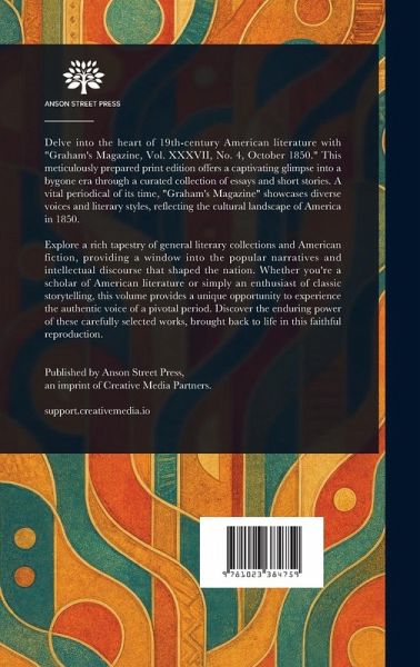 Delve into the heart of 19th-century American literature with "Graham's Magazine, Vol. XXXVII, No. 4, October 1850." This meticulously prepared print edition offers a captivating glimpse into a bygone era through a curated collection of essays and short stories. A vital periodical of its time, "Graham's Magazine" showcases diverse voices and literary styles, reflecting the cultural landscape of America in 1850. Explore a rich tapestry of general literary collections and American fiction, providing a window into the popular narratives and intellectual discourse that shaped the nation. Whether you're a scholar of American literature or simply an enthusiast of classic storytelling, this volume provides a unique opportunity to experience the authentic voice of a pivotal period. Discover the enduring power of these carefully selected works, brought back to life in this faithful reproduction. This work has been selected by scholars as being culturally important, and is part of the knowledge base of civilization as we know it. This work is in the "public domain in the United States of America, and possibly other nations. Within the United States, you may freely copy and distribute this work, as no entity (individual or corporate) has a copyright on the body of the work. Scholars believe, and we concur, that this work is important enough to be preserved, reproduced, and made generally available to the public. We appreciate your support of the preservation process, and thank you for being an important part of keeping this knowledge alive and relevant.